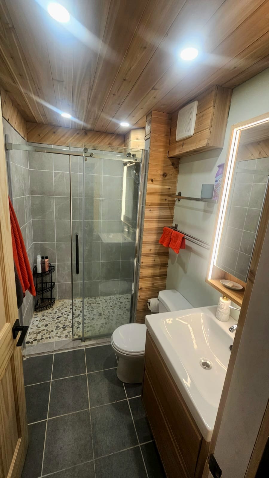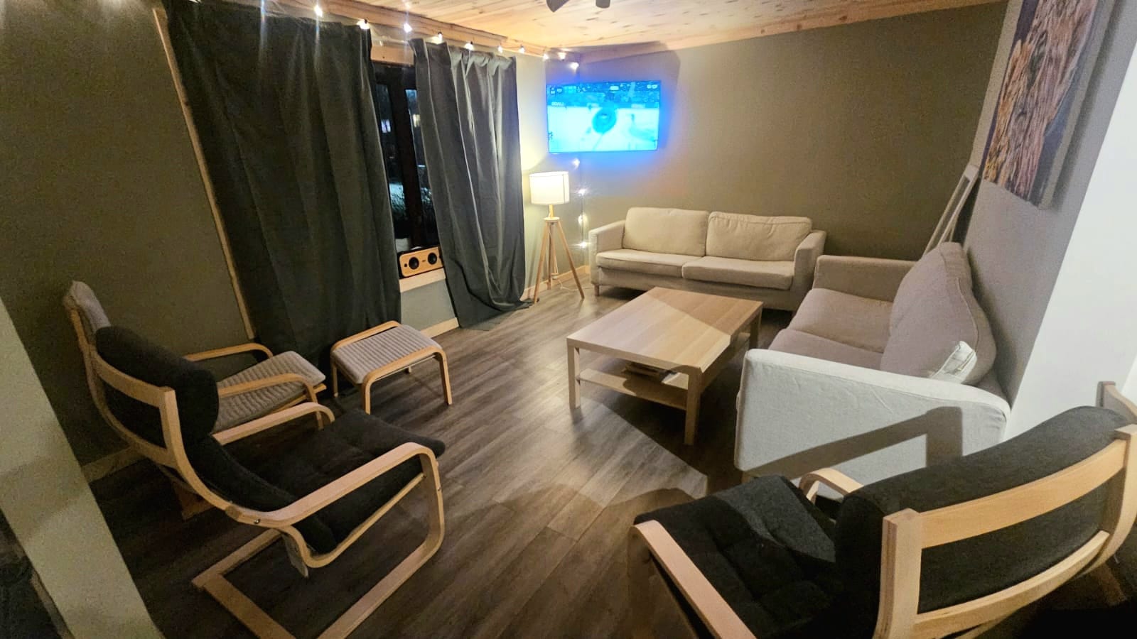 Starlink internet, charging outlets, widescreen Smart TV in the living room.